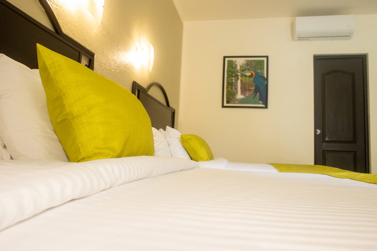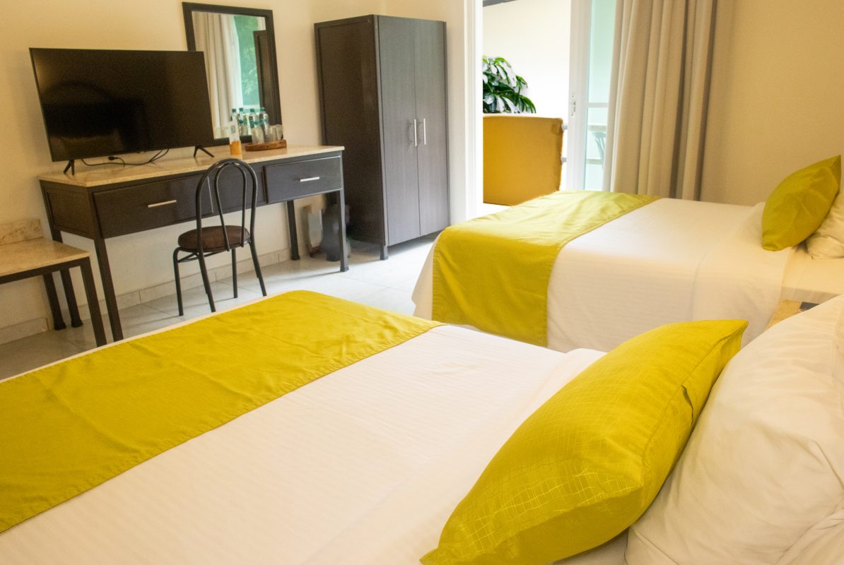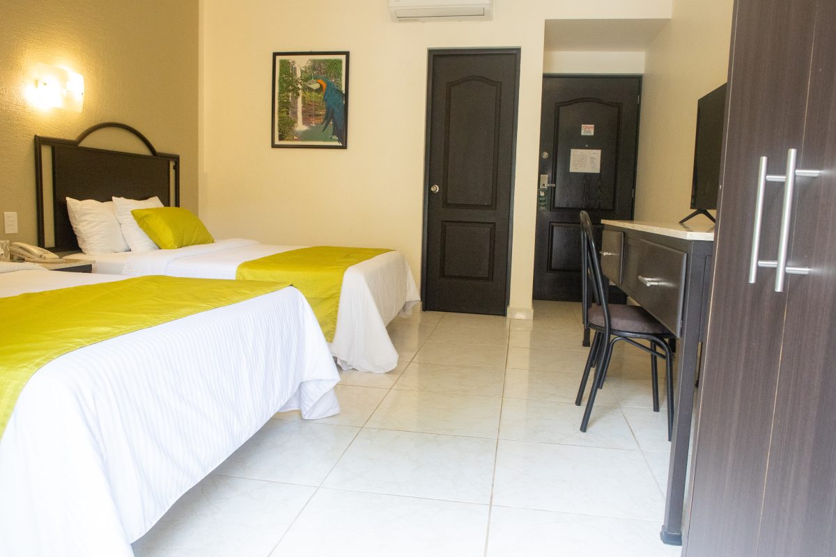 Ideal para familias o amigos que buscan comodidad y espacio. Disfruta una habitación amplia con dos camas matrimoniales, aire acondicionado, TV con cable y baño privado con agua caliente solar. Todo lo que necesitas para descansar en Palenque.