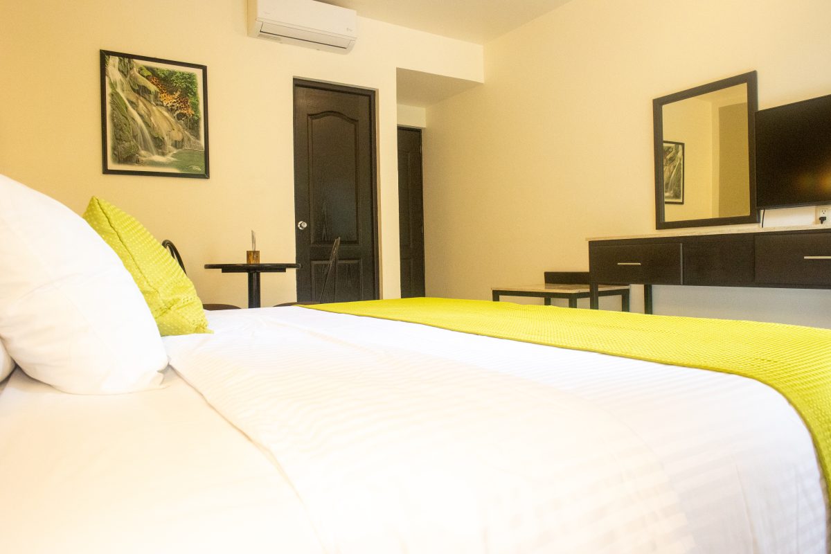 Descansa cómodamente en una habitación amplia y acogedora, equipada con cama King Size, aire acondicionado, TV con cable y baño privado con agua caliente solar. Perfecta para relajarte después de explorar la magia de Palenque.